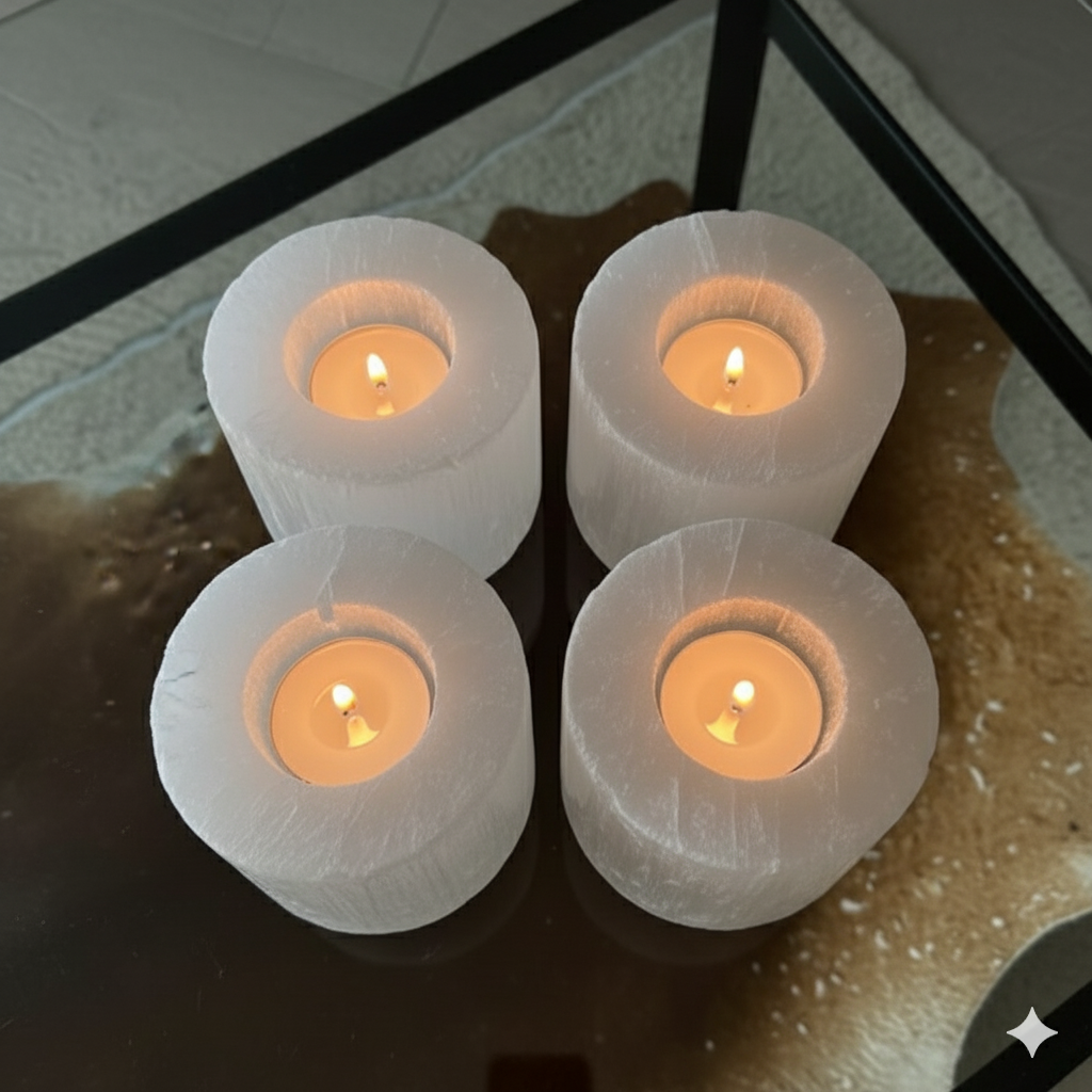 - 💎 Handmade & Unique – Set of four one-of-a-kind selenite candle holders.